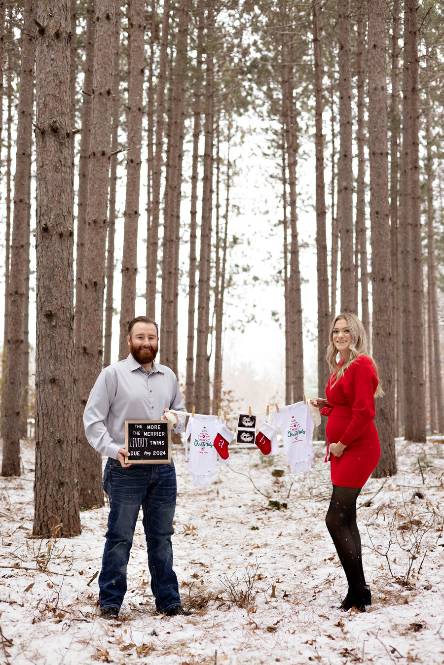 This session is one of the most special I’ve ever, ever done. It warms my heart a thousand times over to be asked to do this session for my sister and her husband AND to be able to share this with the world. After my morning Christmas mini sessions in Webster, WI over Thanksgiving weekend, my sister, her husband and I ventured out into the beautiful snowy woods on our parents’ property to capture these absolutely perfect photos for them to announce BABIES! Yes, you read that right, BABIES! I’m sure you’ve seen this first photo floating around on Facebook. We had not intended to do photos in my Christmas mini session set up, but I asked my sister if we could snap a couple quick anyway because her red dress was PERFECTION in the set. I was able to post it online because she was perfectly posed so their secret wasn’t revealed just yet.